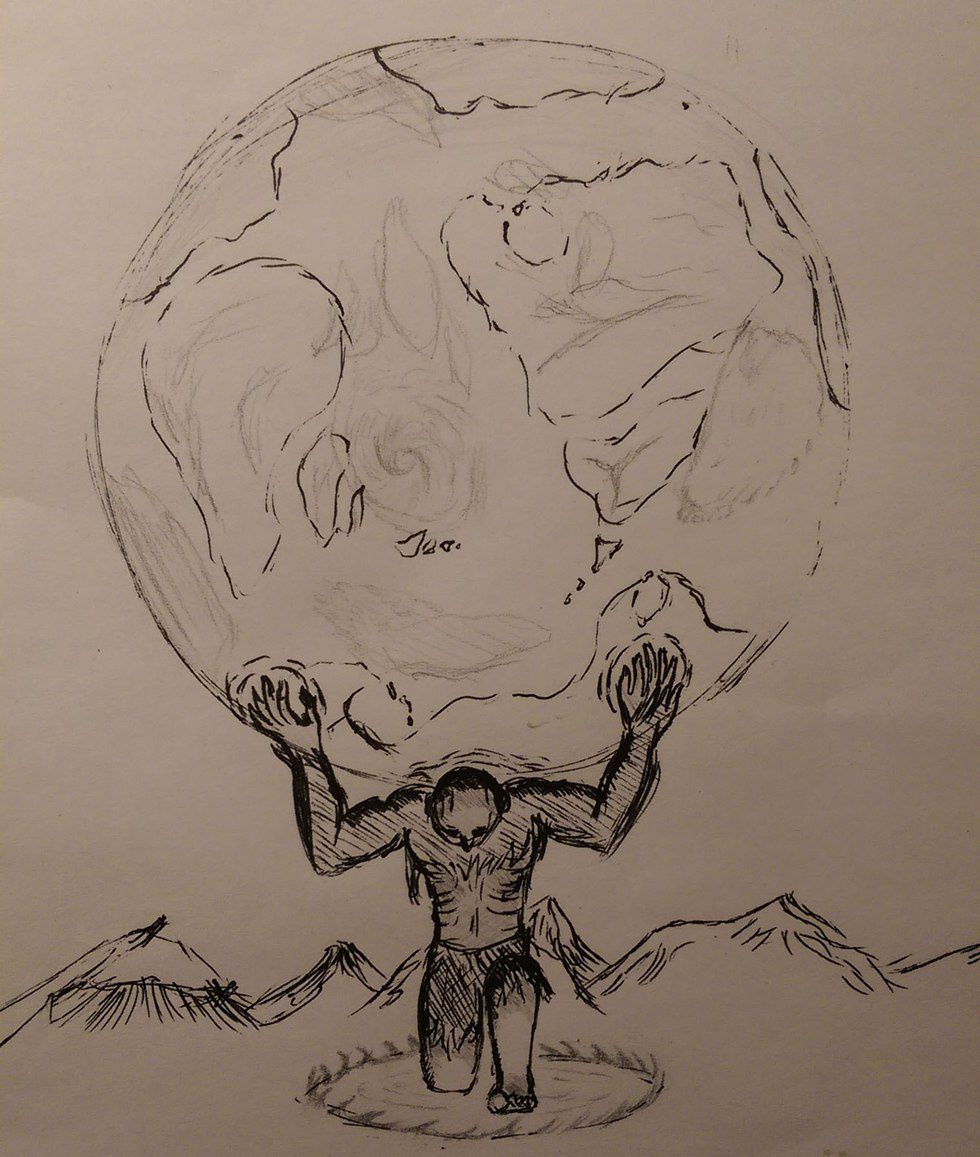 This drawing is pretty simple. It is my own version of the Greek Titan, Atlas. I know he is supposed to hold up the heavens, but I like the idea of Atlas holding up the world itself. The mountains in the background were drawn before the world in his arms was. Now I like to imagine that he is in another place entirely and that he holds up the world while its inhabitants are unaware.