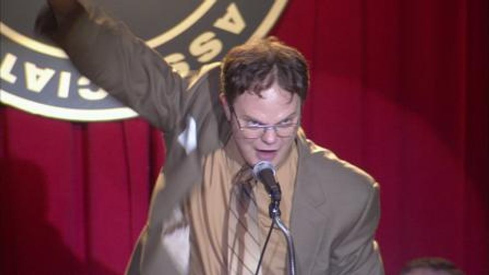 When Dwight wins salesman of the year, he must give an important speech to the entire company. As Dwight gets nervous, Jim jokingly gives him "advice" for his speech, which consists of similar tactics other powerful speakers use, making Dwight look ridiculous. However, in the end, the crowd goes wild for Dwight, shocking the entire office.