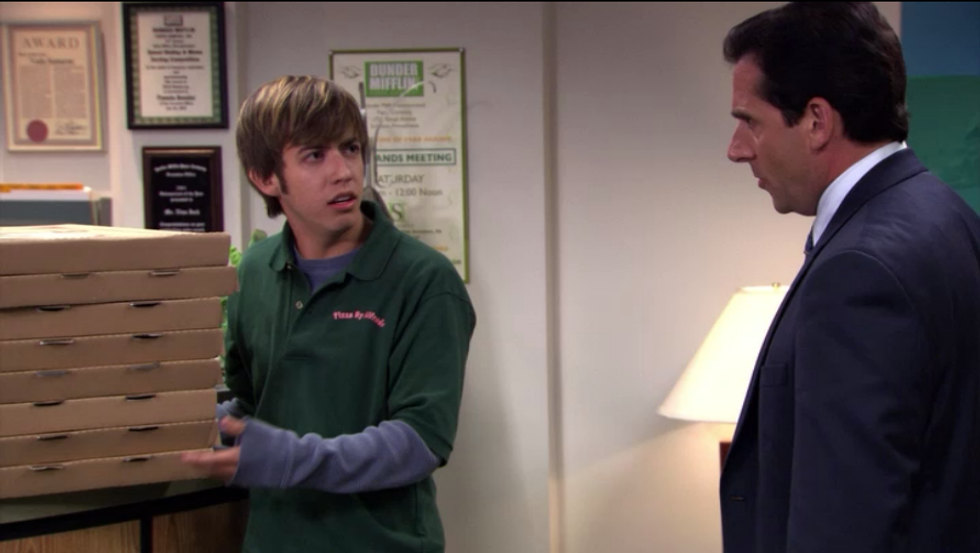 In the episode, Michael Scott abducts the pizza delivery guy while Dwight attempts to out-sell the computers in spite of winning back Angela.