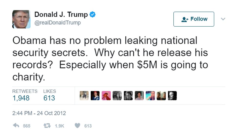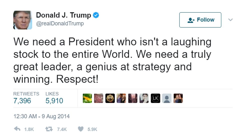 If you haven't been to the Subreddit: Trump Critisizes Trump, there is a hole in your life that you did not know existed until you visit it. It will make you laugh, it will make you cry, it will make you smash your head into a brick wall and want to gouge your own eyes out all at the same time. For your viewing pleasure or lack there of, I have saved you the countless hours of scrolling through these insane tweets and present to you the best and most relevant one's in Trumps arsenal. Please keep in mind while reading these that this person has access codes to nuclear weapons. Just let that sink in.