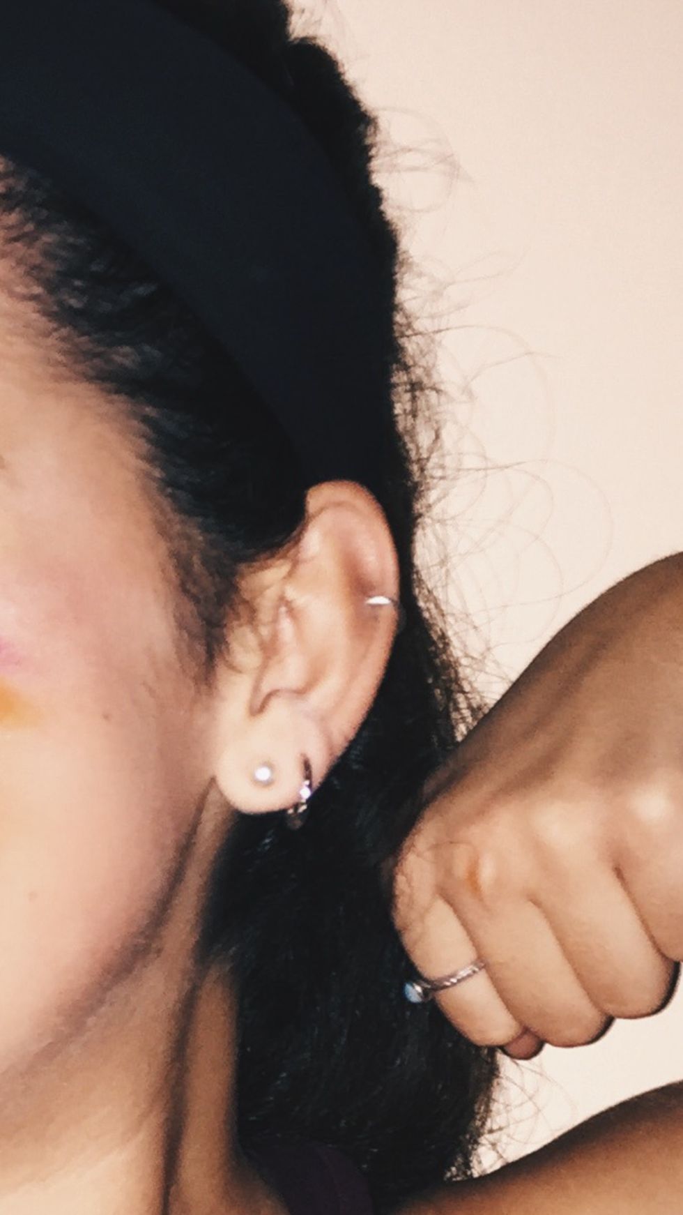 This is a piercing I got in the summer of 2017 that my best friend actually performed with alcohol, a lighter, and a sewing needle. It took a bit for one to heal, but the one that healed the quickest looks awesome with a hoop I put in. It's one of my favorite piercings and if I'm being honest, sometimes I do my hair just so you can see it. Shown above is a pixely screenshot of my cartilage piercing featuring my beloved hoop.