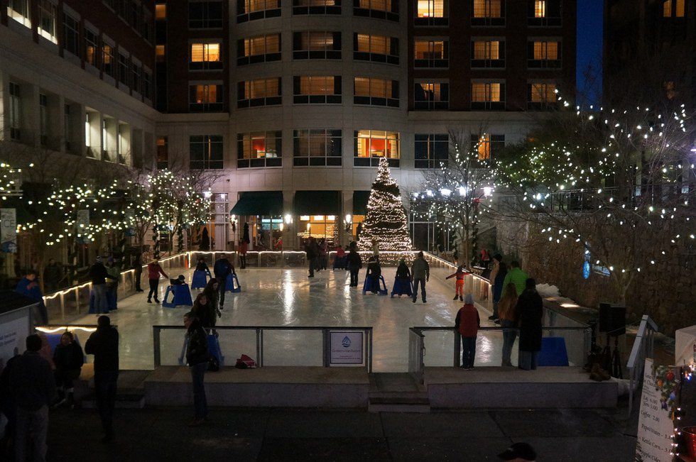 Usually green space throughout the rest of the year, this little area is transformed into a cute ice skating rink during December. It's right in front of the beautiful Marriott Hotel in downtown Greenville.