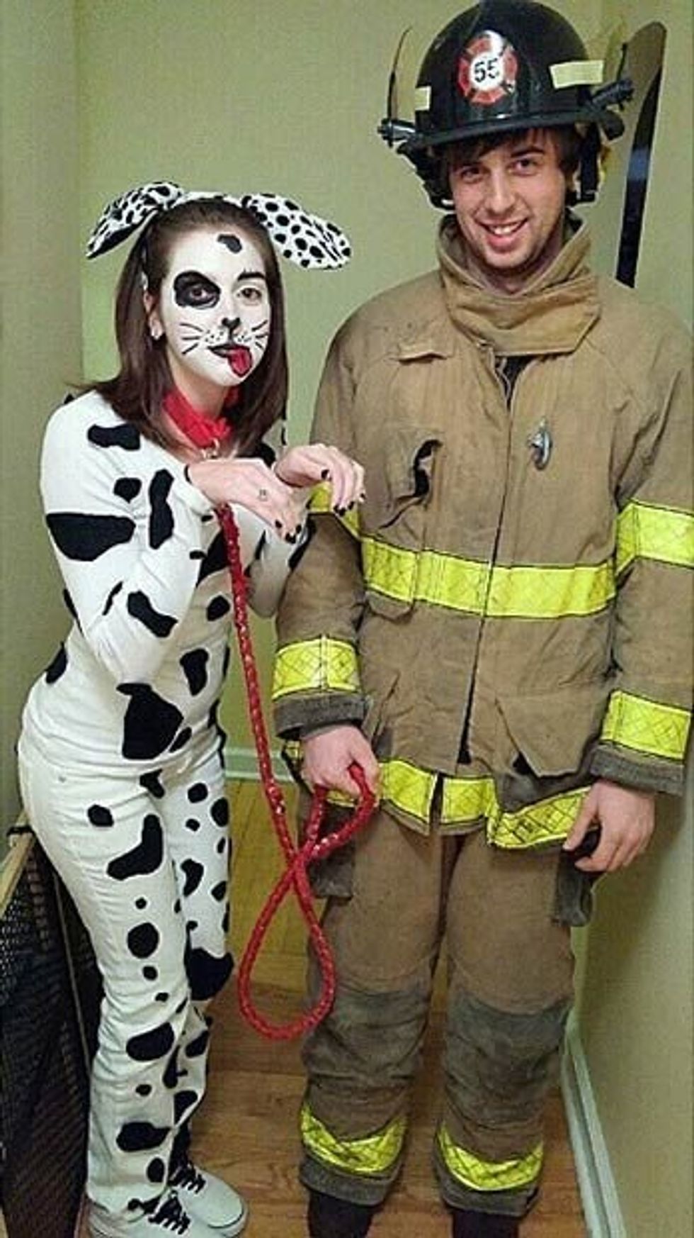 This idea is super cute and simple! Of course, it works better if you have an actual fireman suit, but it can also be accomplished by a navy blue shirt and some red duct tape to make some DIY suspenders. For the female aspect of the costume, she could do an entirely white outfit or just a t-shirt with some black shorts. Black construction paper and tape would be needed to make the spots on her costume, and some rope to make a leash if you wanted to go that extra mile! Average cost: $5-$10 for tape and construction paper!