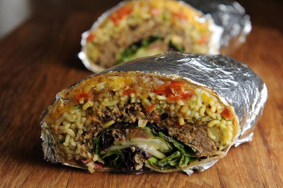 This bipolar burrito merges ramen noodles with Mexican food — and the result is like a bowl of Asian noodle soup minus the broth and it's easy to hold.