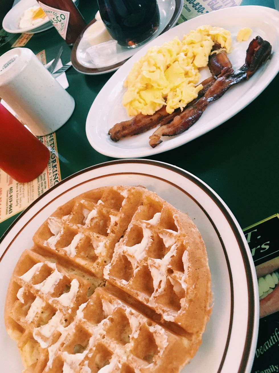 Located only one mile from Hohokam Stadium, home of the Oakland A's, this diner was interesting, to say the least. My friend and I walked into the owner saying someone walked out on him that morning and the gentlemen at the table next to us were retelling stories of his old girlfriends and he had more ladies than I could count on my fingers and toes... Aside from that, the food was amazing. The bacon was crispy, the waffle was crunchy on the outside and fluffy on the inside and the eggs were cooked to diner perfection. If you're looking for a place with great breakfast food, this is it.