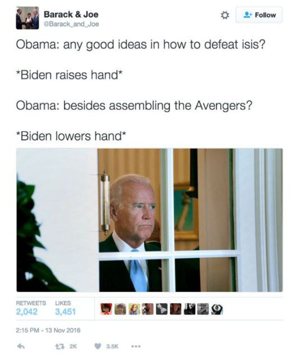 Thank you, Mr. Biden, for serving this country for eight years. When the President and his wife go eight years with no scandals, it's nice to know that the good 'ole VP will step in and become countless memes for the world to enjoy.