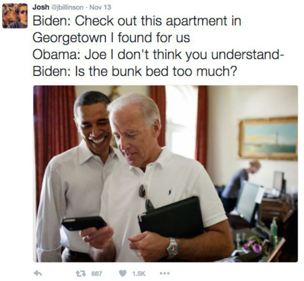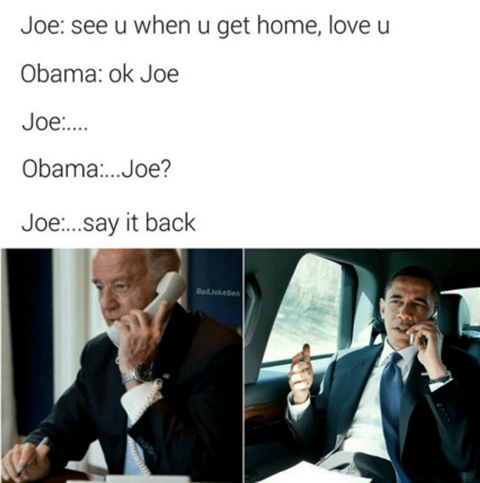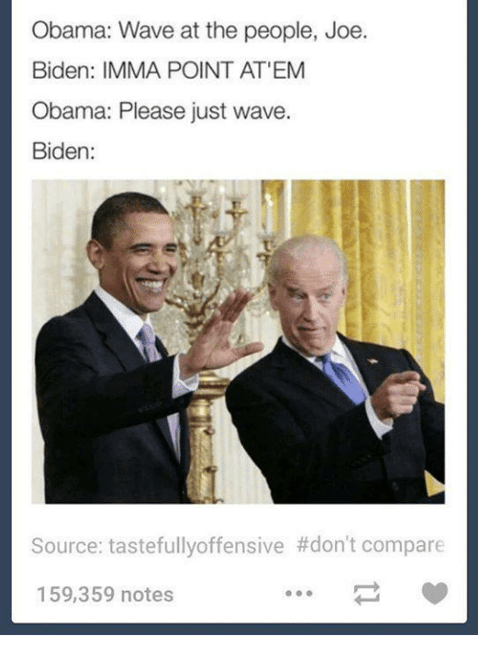 Joe Biden: The Internet's favorite subject as of late when it comes to making entertaining memes. They have certainly made the whole thing about the Obama administration ending much easier, and provided some much needed comedic relief during this topsy-turvy transition period between Obama stepping out of office, and Trump taking his place. And so, in honor of Biden's term at VP coming to an end, I've decided that these are the best memes to come out of America's Favorite Bromance: