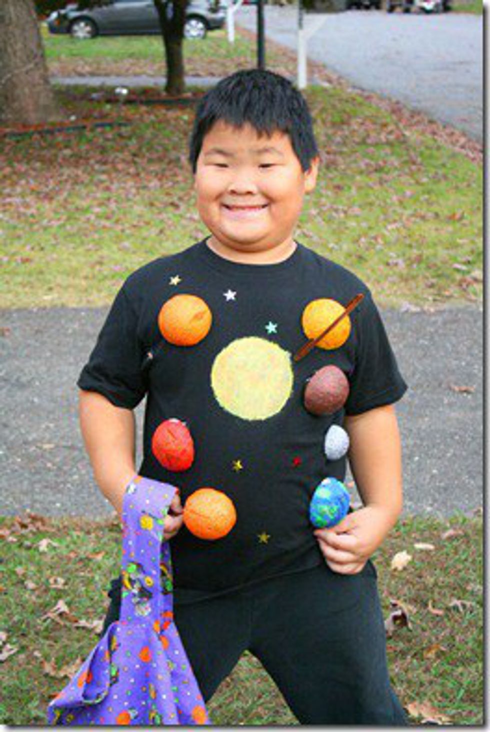 - The solar system-- With plenty of solar-system themed clothing pieces out there, being the solar system would involve taking a trip to your local store and picking up some solar system themed gear. Planets can also be made using styrofoam balls. You can dye these balls different colors using food coloring and then glue them to your shirt to transform into the solar system.
