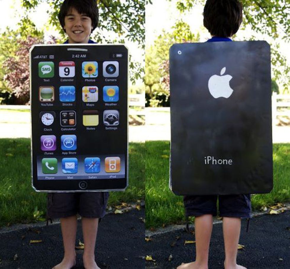 - iPhone-- Let’s face it: most of us are addicted to our iPhones. Take a screenshot of your iPhone home screen the next time you’re on it (which is, like, all the time) and then send it to yourself so you can print it. Then attach this picture to the front of a cut cardboard box that you can put around your body. On the back , you can color the box using a black sharpie, leaving a little hole for the camera and the Apple logo.
