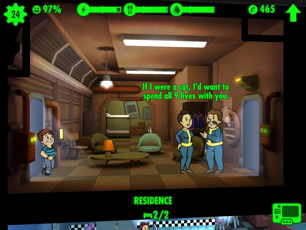 As you begin to dive deeper into Fallout Shelter one of the benefits is creating a thriving community. As the overseer, your dwellers give you feedback to their happiness and also advice as to what you can do to make their lives underground a lot better. The overseer can equip dwellers with weapons, outfits and can also send them out to the wasteland to collect items such as materials to make clothing, weapons, stimpaks, and radaways. As you take care of your dwellers, you will begin to see the overall happiness of the vault improve because you have successfully provided a thriving community for your dwellers.
