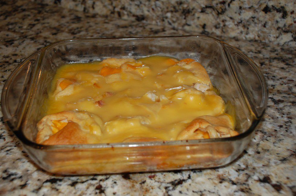 4. Stuff shredded chicken and cheese into a crescent roll and wrap it all up.