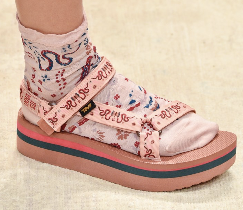 Also known as "tourist sandals," Tevas are back in style. In the past, they have been considered chunky, clunky, and ugly, but now designers are proudly pairing outfits with Teva style sandals. Anna Sui and AMI Paris are some of the fashion brands that featured Teva sandals on the runways for Spring/Summer 2019.