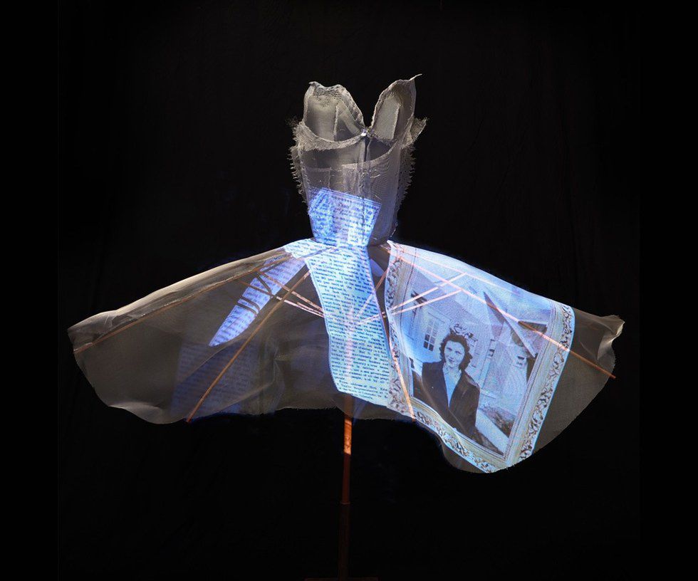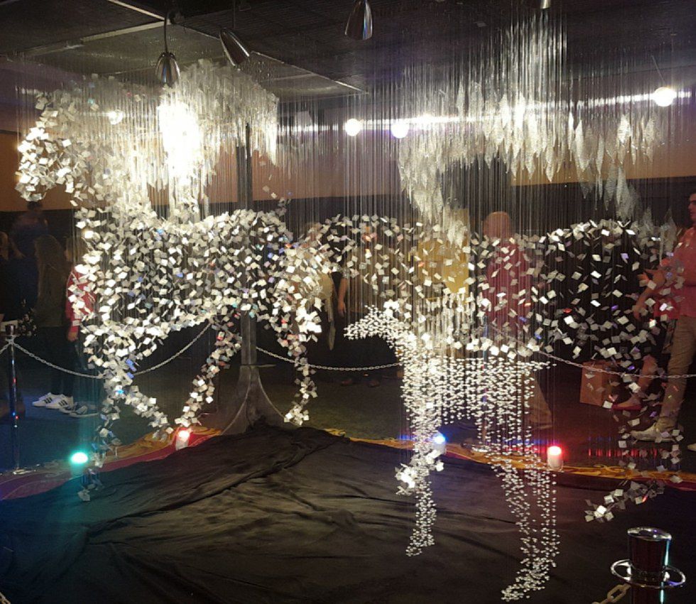 This piece, which was found in the Amway Hotel, is a depiction of winged horses all made using small silver squares hanging from string.