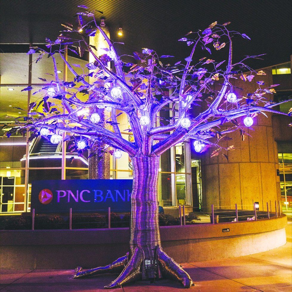 "Invasive Species" was a life-size tree made of steel and wrapped aluminum. It's LED lights allow it to be interactive and visually pleasing to any who view it.