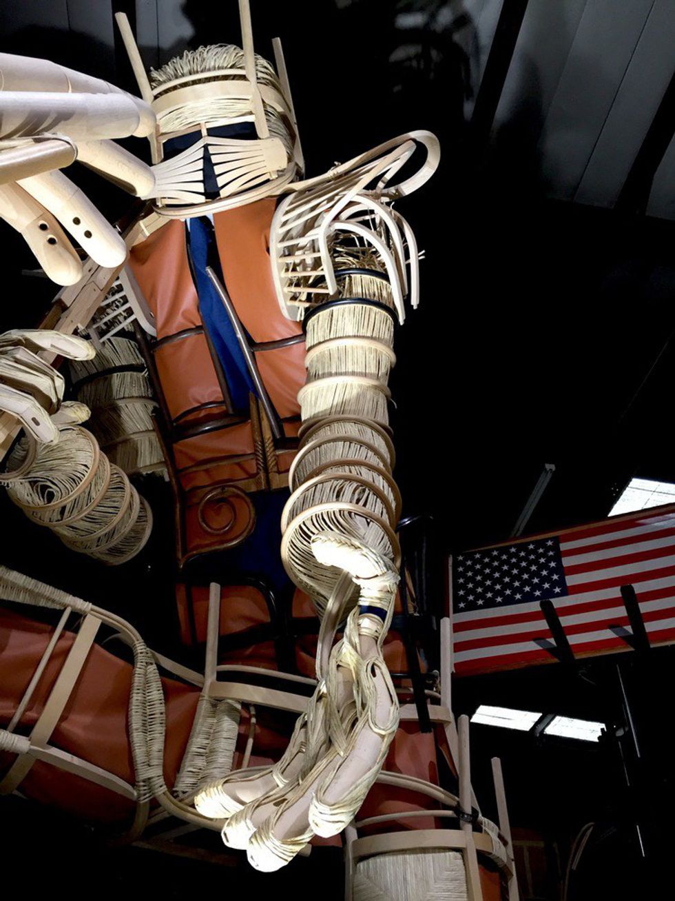 The soldiers in "Victory" stand 16-20 feet tall and are completely made out of chairs. These chairs, which are taken from all parts of the world, represent unity and the idea that everyone needs a helping hand.