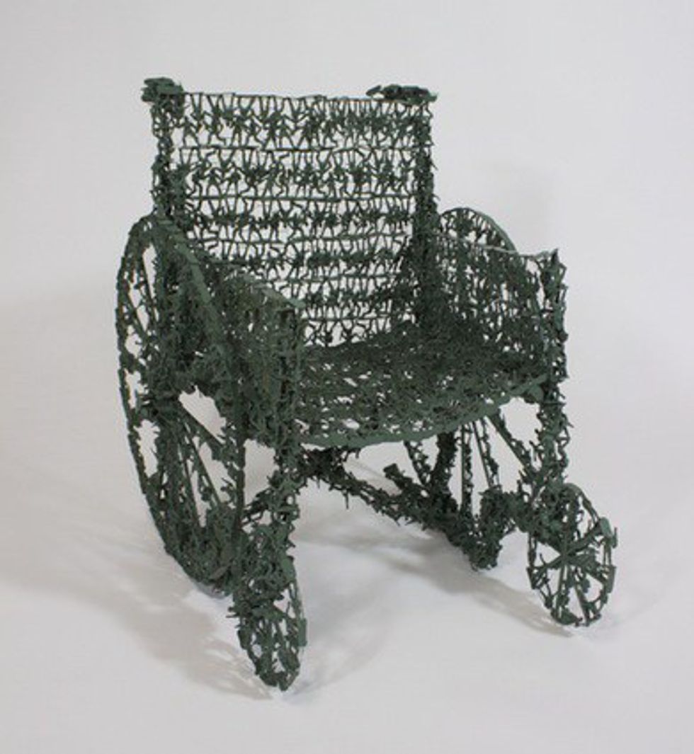 "Wounded Warrior" is a life-size wheelchair constructed entirely of plastic toy soldiers. This piece is notable, not only for the way it was created, but for the story it tells about the devastation soldiers can be faced with.
