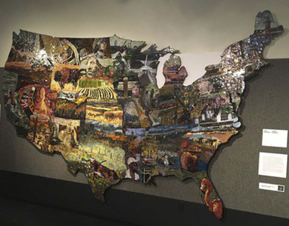 "Continental U.S." is a glass collage that demonstrates the heritage of 48 states (Hawaii and Alaska not included). It is amazing enough that the collage was created using tiny shards of glass, but Hollstein also allowed her viewers to feel a sense of nostalgia as they gazed upon their home-states.