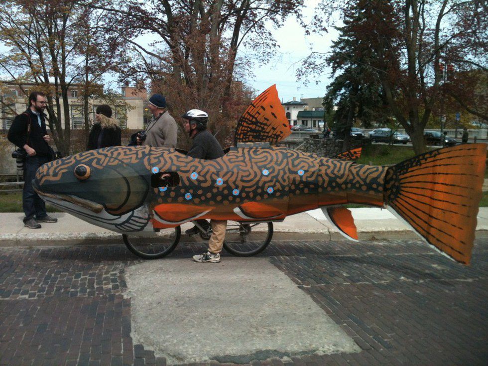 Last, but certainly not least, is "Trout Bike". This fully functioning bicycle is attached to a giant brook trout, which is made from paper, old carboard, and scrap lawn chair pieces. When in motion, the fish tail moves back and forth, mimicking that of a swimming fish.