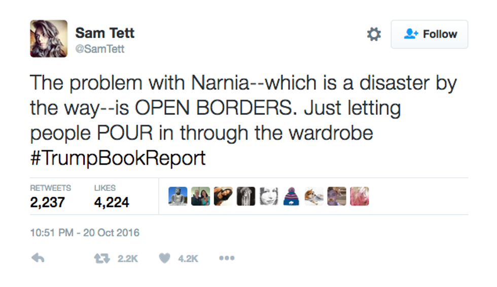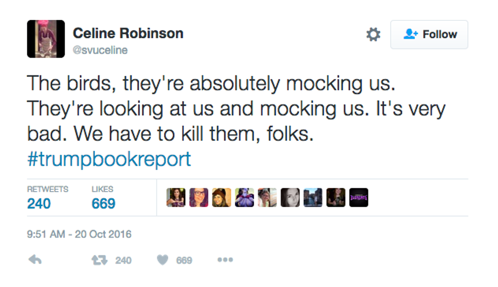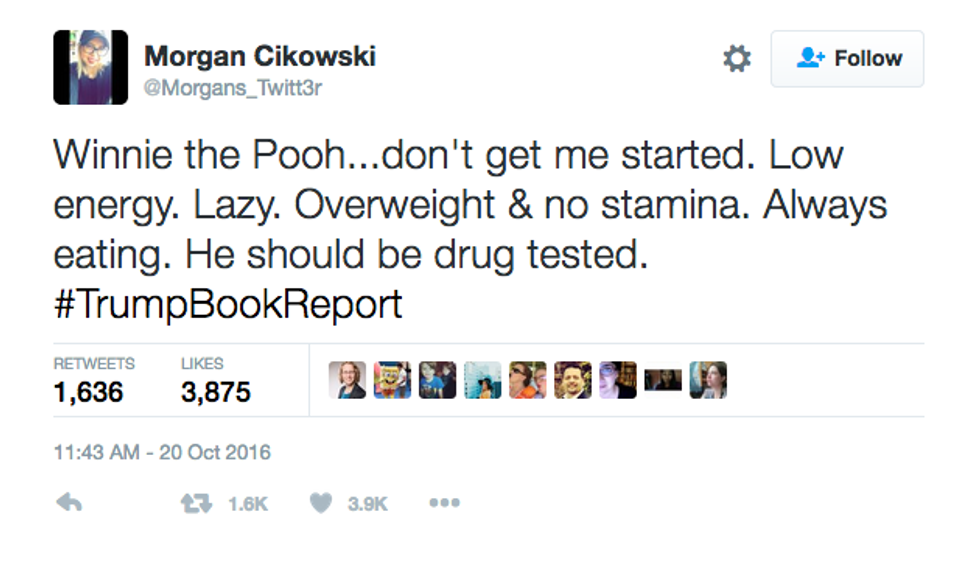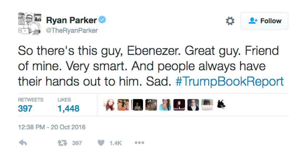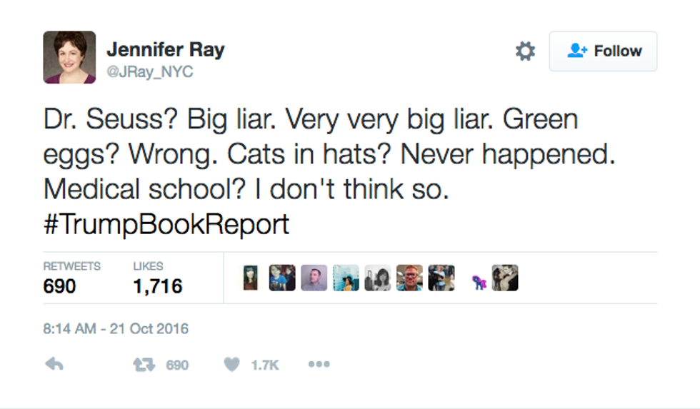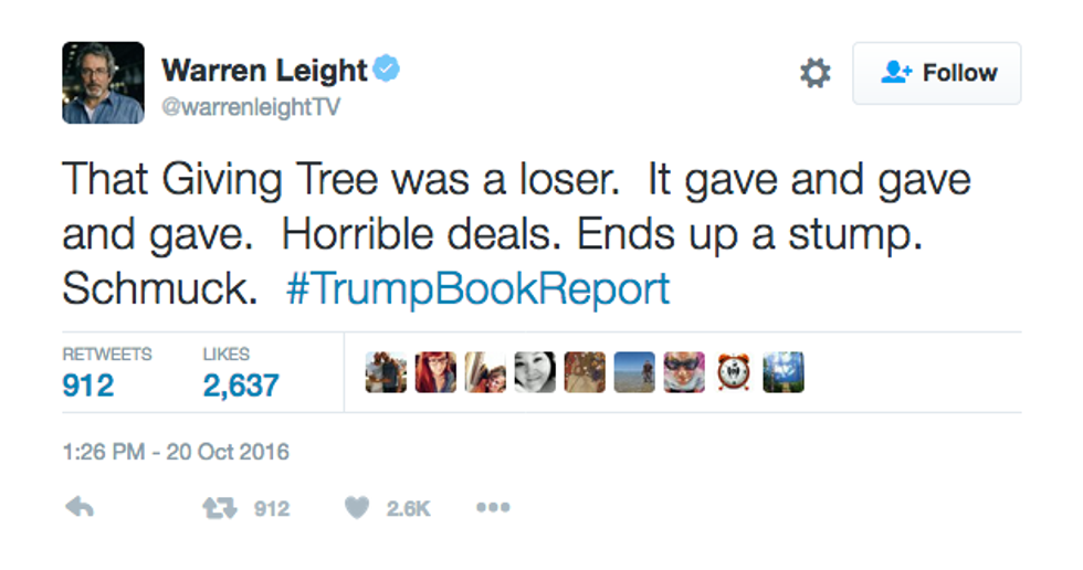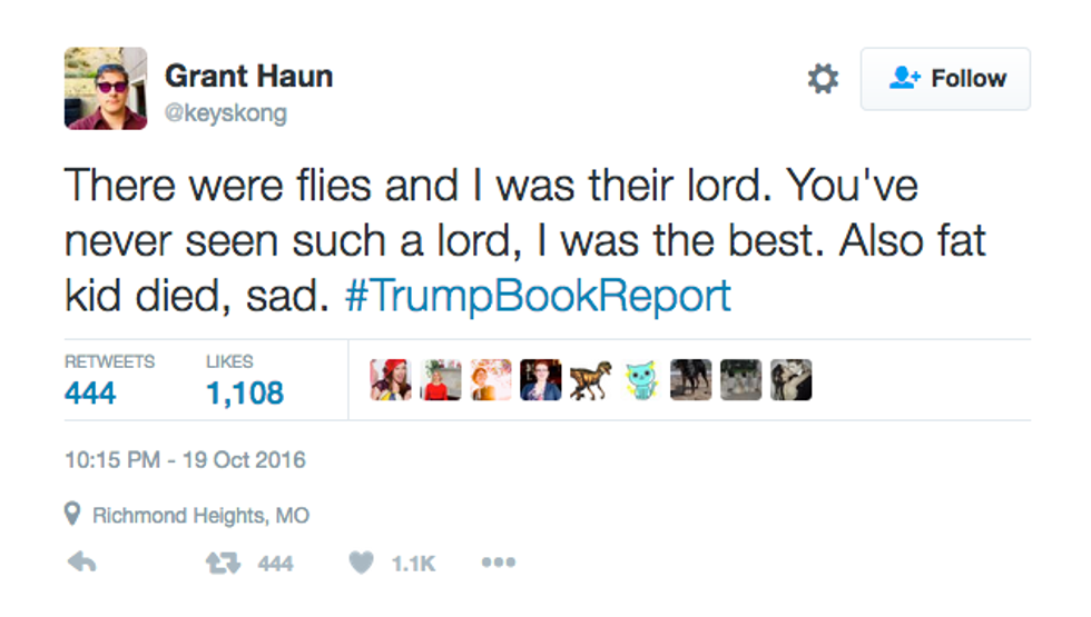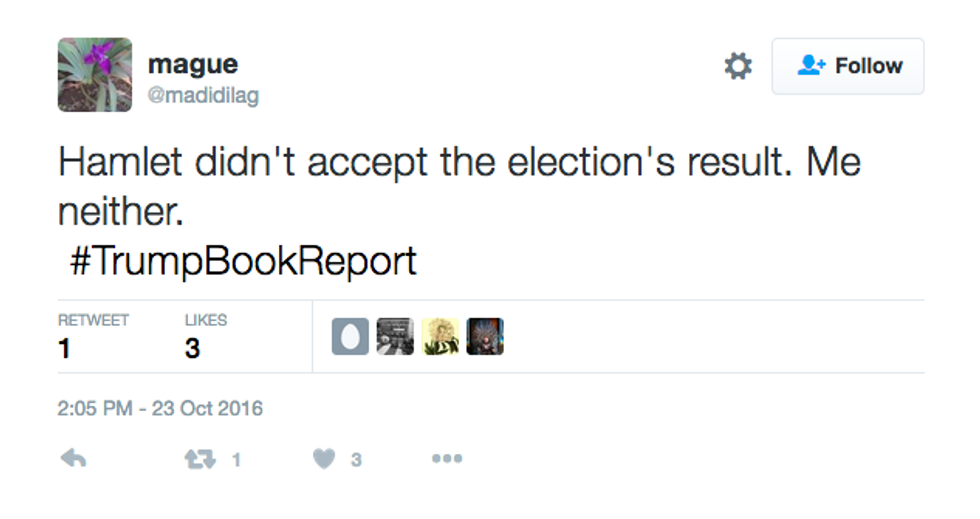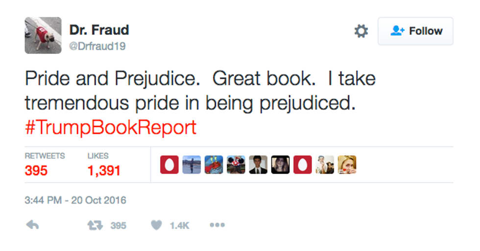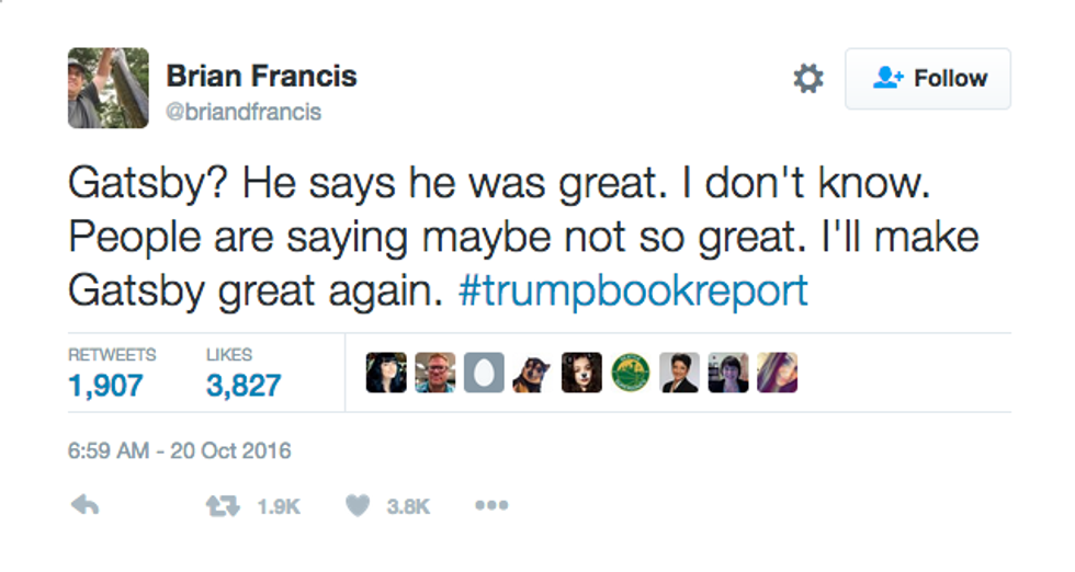 Earlier this week, I was just scrolling through Twitter trying to ignore any tweet concerning the upcoming presidential election. I'm not one to usually share my political prowess, but I stumbled upon a hashtag that I had to share as a book lover and self-proclaimed word addict alike. The hashtag #TrumpBookReport kept me laughing and reading tweets out loud for much longer than my roommates approved of. In each tweet, a person would make up how Trump would summarize a certain piece of literature. From children's books to Shakespearean classics, "Trump" seems to have read them all. Here's my top 10 so that you don't have to scroll through Twitter looking for the best of the best (although I recommend doing it anyways for the laughs).