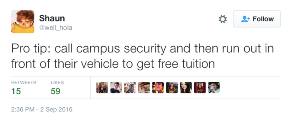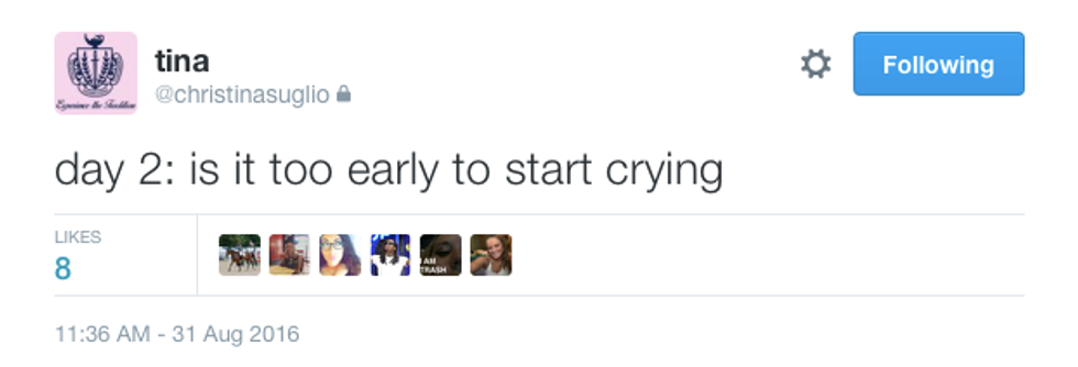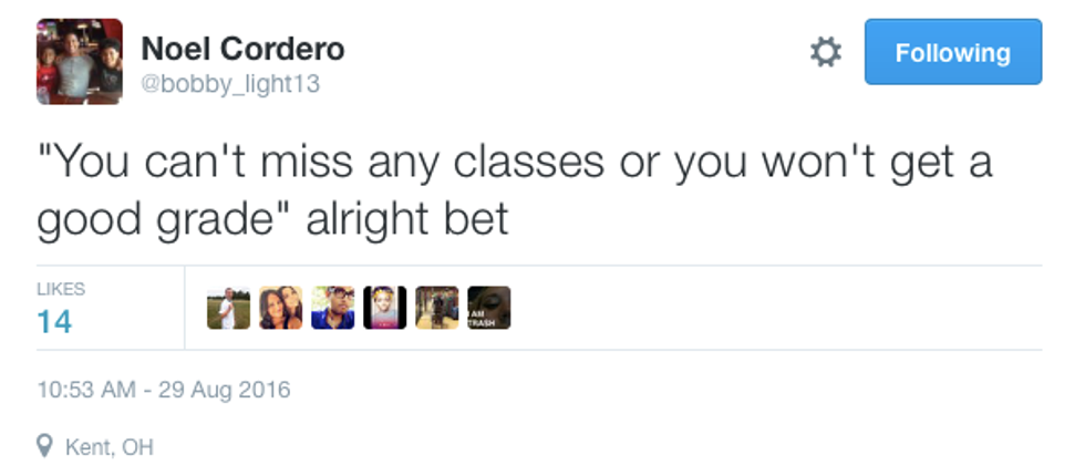 Welcome back students, it's time for the lectures, tears, and of course the "responsible" parties. Although I have only been back for a week and a half now, I'm already over the semester and it seems like other people are too. Here are some of my favorite tweets I've seen these past couple weeks about people's feelings of college.