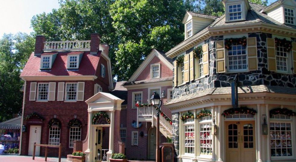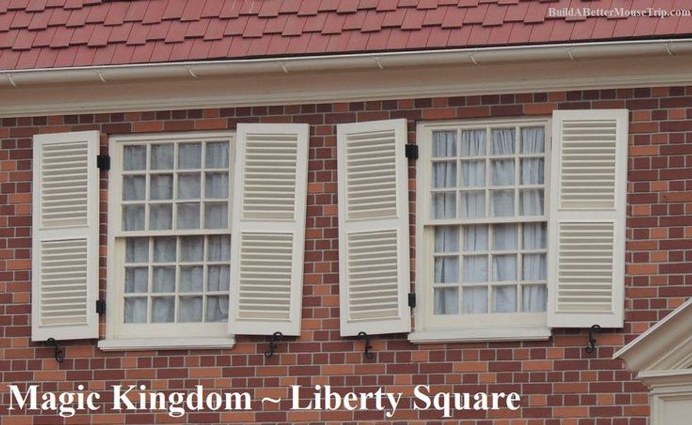 In Liberty Square, all of the shutters are hung slightly at an angle. This is because during the revolutionary war, England stopped shipping the US almost everything made of metal because the colonials would melt them down for bullets. One thing they did continue to ship was shutters. The colonials would take the metal hinges off the shutters to melt down for bullets and would hang the shutters with leather straps. Over time, the leather would stretch out, causing the shutters to hang at an angle.