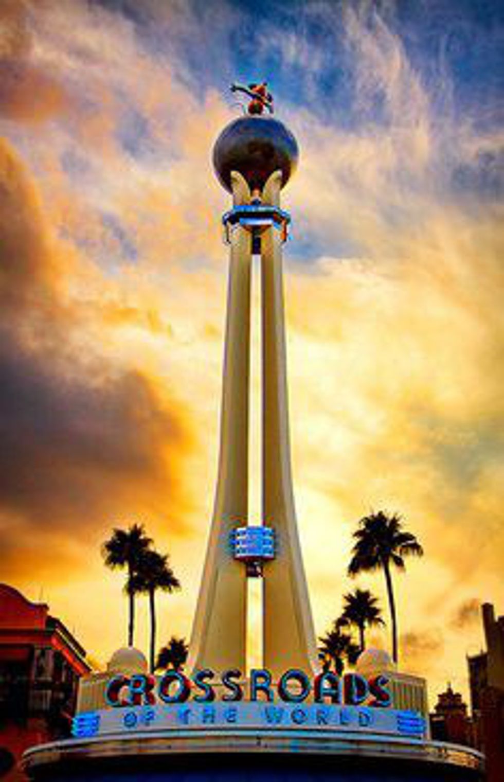 There's a Mickey Mouse on top of Crossroads of the World right inside the entrance to Hollywood Studios that waves to all who enter and exit, but that Mickey also serves another purpose. He's a lightning rod. One of his ears is made of copper to attract the lightning.