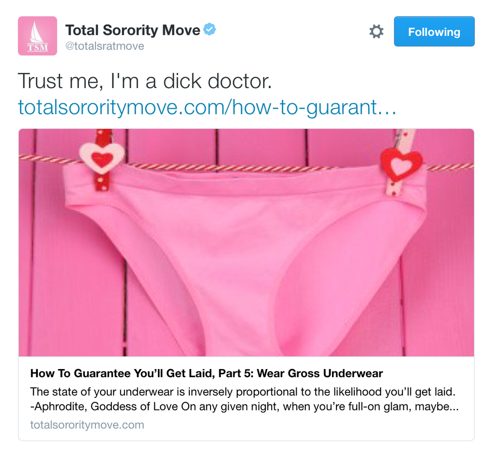 "Trust me, I'm a dick doctor." "How To Guarantee You'll Get Laid, Part 5..." Part 5?! If you need a read on how to get laid, why not read Cosmopolitan magazine? We do not need to teach that on a website about sorority women.