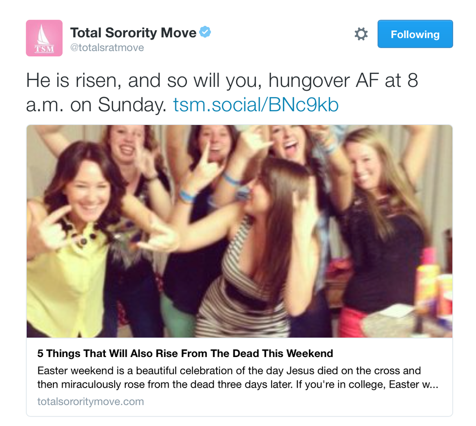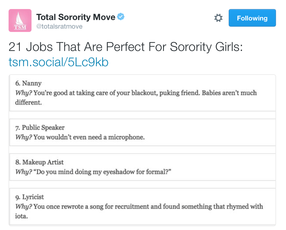 As I have been scrolling through my Twitter feed lately, I have been noticing many articles posted by Total Sorority Move that have made me frustrated. Why? Because Total Sorority Move makes sorority women look immensely stereotypical, insensitive and just overall gross. Let me just say that not every single thing TSM posts is horrible, just the grand majority. That grand majority is what gets the most views and what TSM promotes the most via social media. This means that if people actually take this content seriously, that makes me, as a sorority woman, look immensely stereotypical, insensitive and just over all gross to an outsider. I don't know about you, but I definitely do not want to or wish to be portrayed that way.