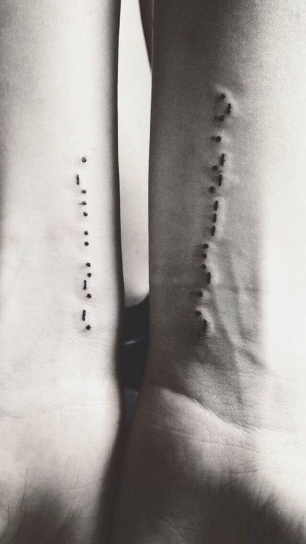 "The short one is morse code for 'alive.' A few years back, I was at a really dark place, and I didn't feel like I was alive, because I was so numb to everything. When I finally got in a good place, I was able to realize that even if I feel numb, I'm still breathing; I'm still alive for a reason. The longer one is morse code for 'recovery.' While I was in my dark place, I did a lot of damage to myself; physically and emotionally. When I got to a place where I was no longer as prone to do those things, I knew I needed something to remind me that there isn't always going to be bad in my life." -Bree Barfield