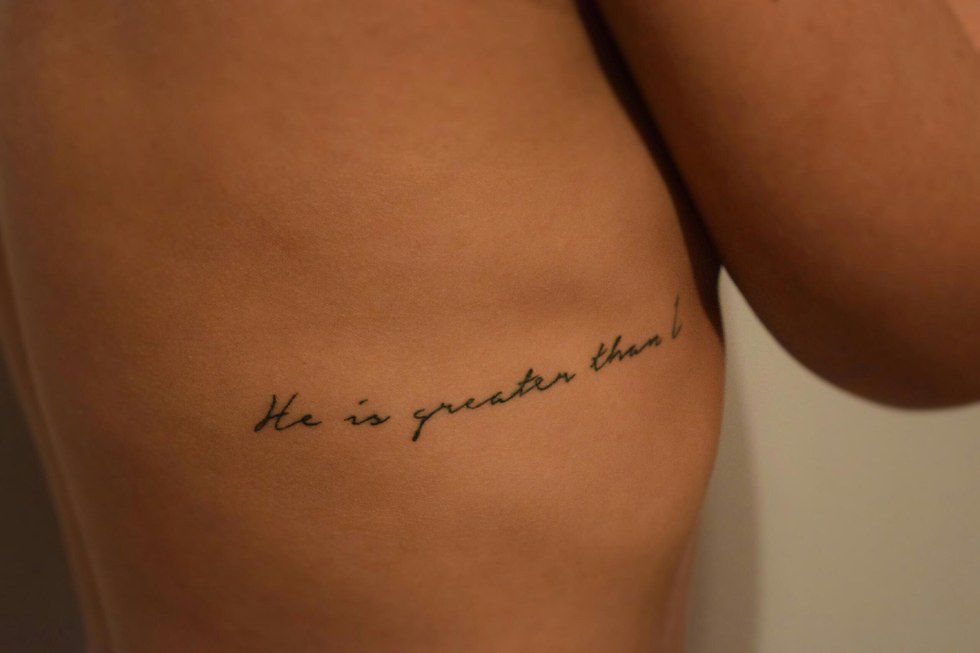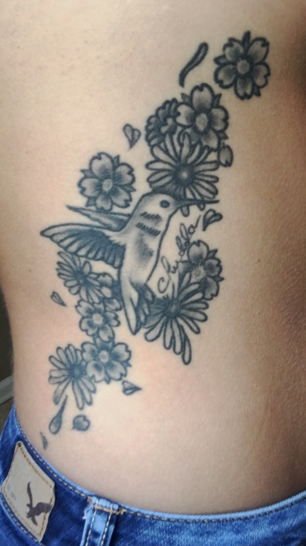 "I got my tattoo in memory of my grandmother who was hands down the greatest, most kindhearted person I have ever met. She passed away from cancer when I was very young but still left an imprint on my heart. I remember her as a woman whose laugh echoed through the house, who was always singing old hymns, who could cook better than anyone I have ever met, and best of all could make you feel like a giant when the world made you feel so small. She was as unique as the name her grandchildren called her 'Chudda.' The hummingbird and flowers remind me of the hours that we would sit in the kitchen watching the tiny birds flutter back and forth from flower to flower in the garden that my grandmother cherished so much. Her signature underneath is from a devotional book that she gave me, which is also the last gift I received before she was called home. In the note she wrote me, she reminded the twelve year old me that I am enough and I am loved, something that I remind myself everyday. She is and always will be the first woman that I truly looked to for guidance and for that I will forever be comforted by the permanently inked reminder on my rib cage." -Kelsey Whitehead
