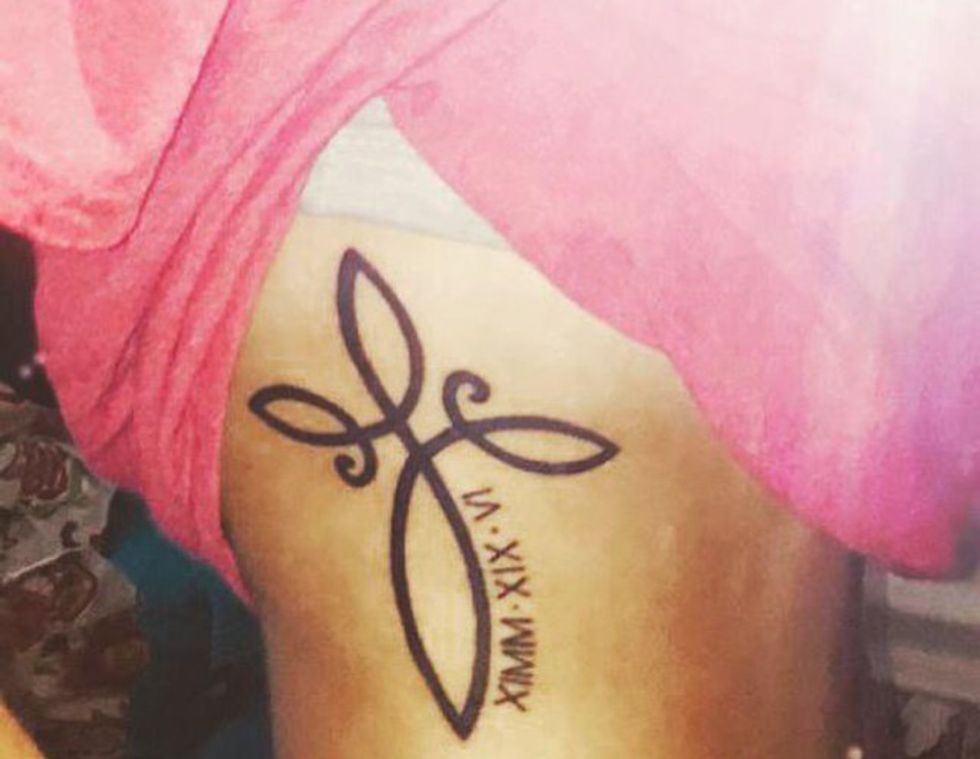 "My dad died when I was twelve and the roman numerals are the date that he died. Ive always thought that the infinity cross was a beautiful thing so I knew I had to put the two together somehow. This is my constant reminder of my daddy's infinite faith in our Lord and Savior." -Aubrey Bonds