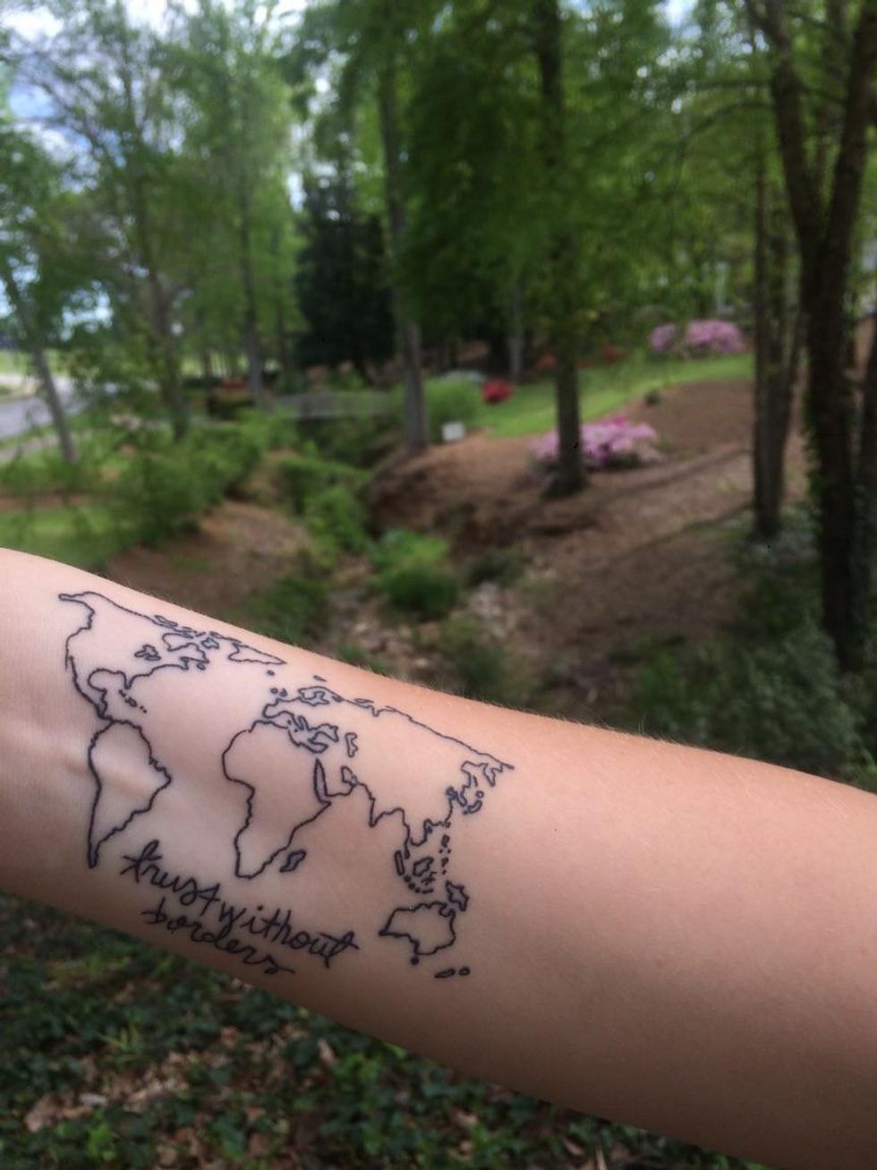 "My tattoo is based off the song "Oceans" by Hillsong where they say 'Spirit lead me where my trust is without borders. You call me out upon the waters, the great unknown where feet may fail. And there I find You in the mystery, in oceans deep, my faith will stand. And I will call upon Your name, and keep my eyes above the waves. When oceans rise, my soul will rest in Your embrace. For I am Yours, and You are mine.' Basically about serving all over the world." -Avery Shead