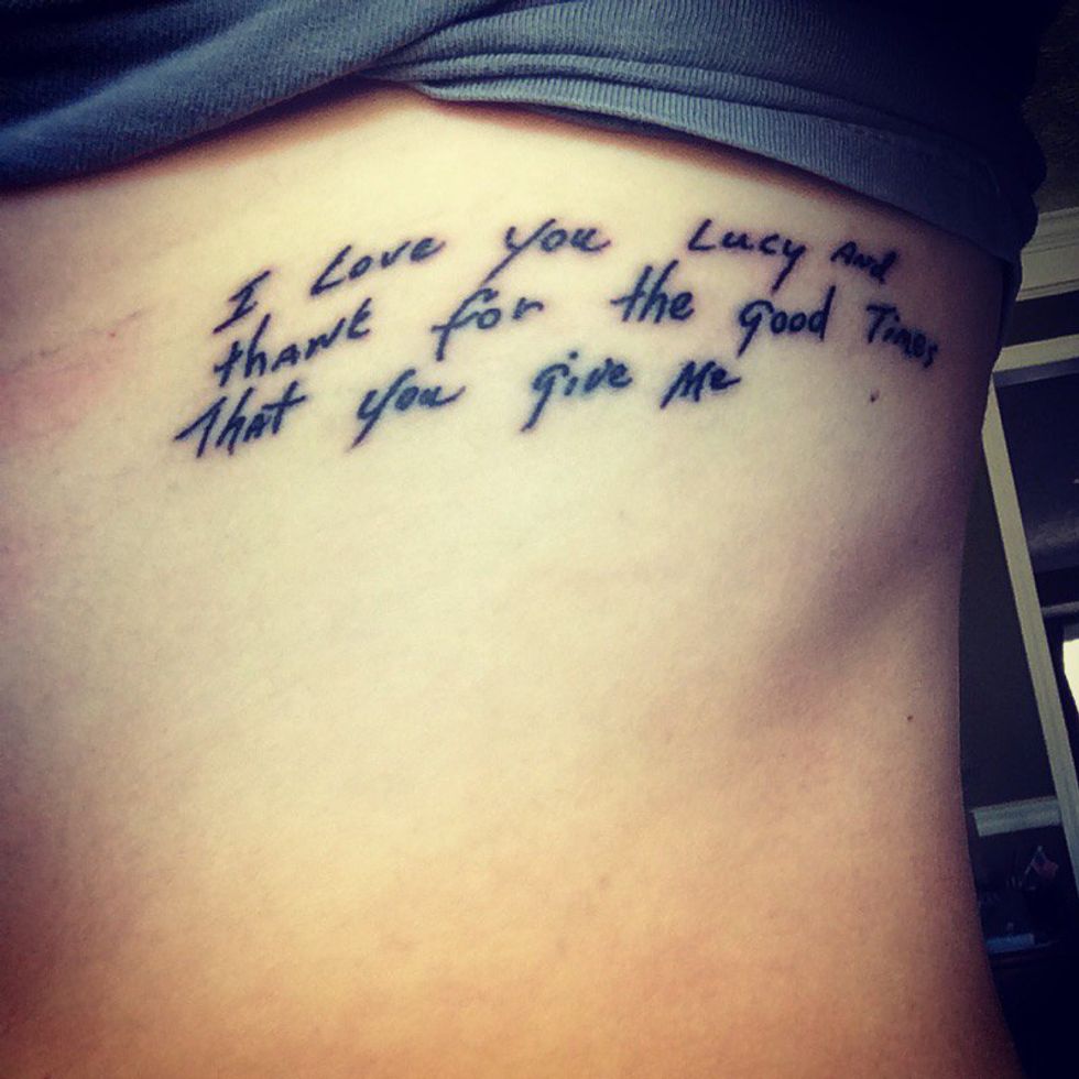"This is my first tattoo. It's a note my poppa gave me when I was in the fourth grade. He always called me Lucy. When he passed away when I was sixteen, I chose to get this tattoo to remember of how fun and carefree he always was, no matter how he was feeling. It's also a daily reminder for myself to make him proud and show he will not be forgotten." -Andie McDaniel