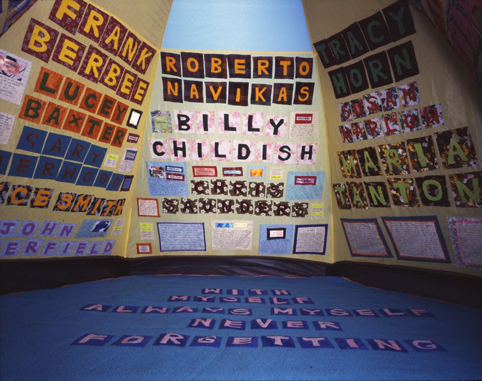 Everyone I Have Ever Slept with 1963-1995 (1995) was described by Emin in an interview as "carving out gravestones." She went on to say it was about "how many people I had slept with or been intimate with, whether it was sexually or just sleep-wise. People went inside The Tent; by the time they come out they were thinking of all of the people they had slept with, the people they had been close to, and that's how The Tent worked."