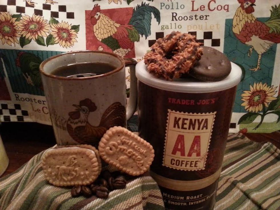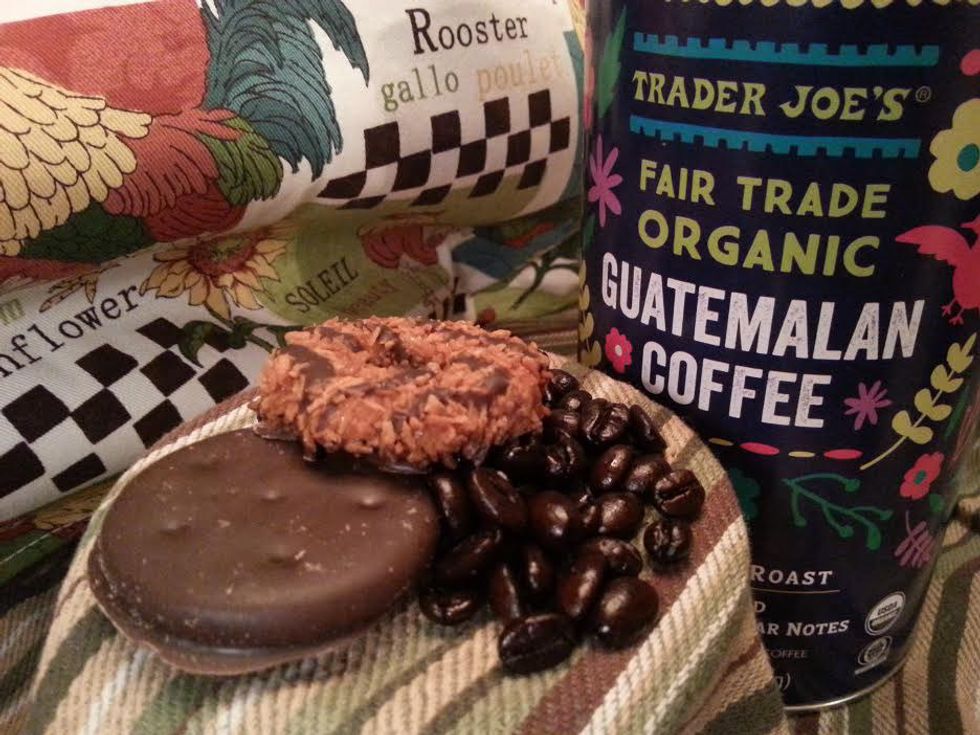 My personal favorite brew is Trader Joe's 100% Kona Coffee. It's rich and smooth without being overpowering. Trefoils, Thanks-A-Lot, Toffee-tastic, and Girl Scout S'mores are my favorites for nibbling alongside or dunking directly into this brew.