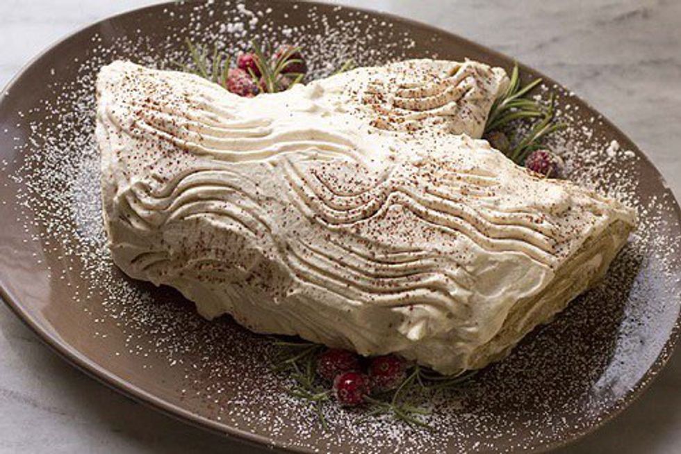 A traditional and extremely elaborate Christmas-themed roulade cake, which is a type of rolled and filled pastry. The name means "Yule log" in French. This dessert is commonly found in French-speaking countries and regions such as France, Belgium, and Quebec.