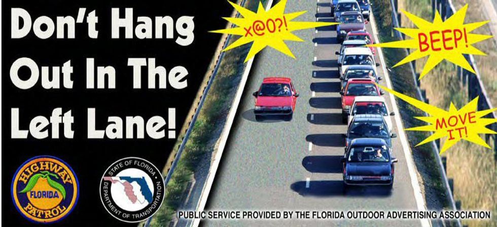 The left lane is a PASSING LANE. Slower traffic is supposed to ride in the right lane, and when someone is riding in the right lane and wants to go faster than the people in that lane, that person can USE THEIR BLINKER and get into the left lane to pass. This brings up another issue. If you can't resist the need to ride in the left lane because you're going to be turning left in 10 miles or whatever reason you may have, make sure you're at least going faster than the people in the right lane. You should not, and I repeat for emphasis, YOU SHOULD NOT be riding next to the person in the right lane. I'm sorry. That's not how this works. In Georgia, police officers can now pull people over and ticket them for riding too slowly in the left lane on a highway.