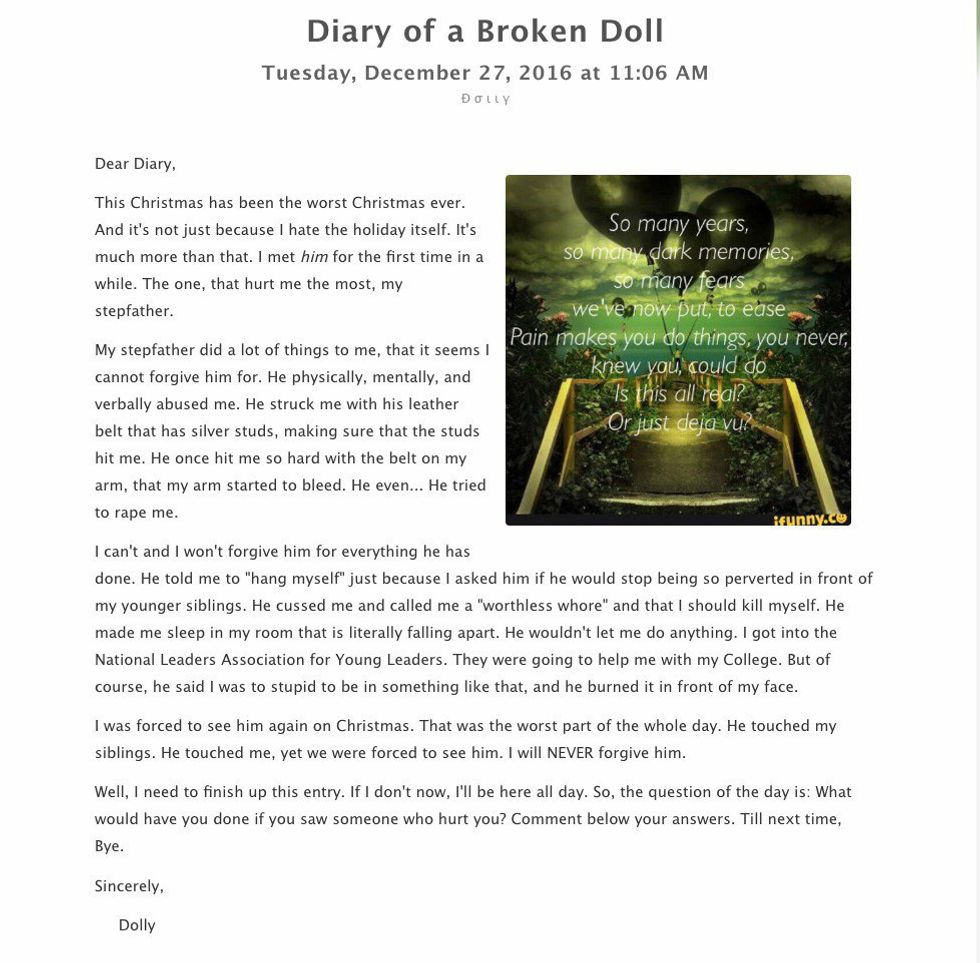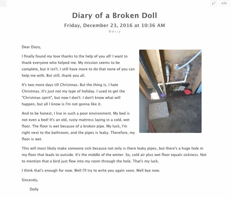 Katelyn didn't just post videos. She also kept an online diary titled: "Diary of a Broken Doll," that was open online to the public. While this diary had been taken down, screenshots of some of her entries still survive. I have read through all the entries and what I found was disturbing and heartbreaking. Ten days before her death, she posted a diary entry. In the entry, she discusses how she isn't happy about the coming holidays, stating: Its just because I am not a very happy person and positive person, ya know? I would be, if it wasn't for everything that has happened. But it seems that time and experience made me what I am today, and I am happy I am not any other way.