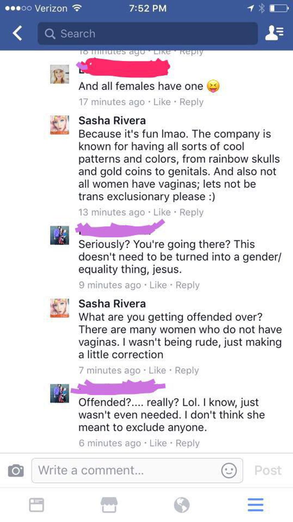 I am part of a Facebook group called Makeup Addicts, which generally just has positive posts about makeup looks and brands. Recently, I decided to post a photo of a highlighter, with a print of a vulva on it, which I bought from Bitchslap Cosmetics. I wanted to share the company and I thought that the other members would find its products entertaining. One commenter asked why the vaginal print was necessary, and then another reply (red) followed with “And all females have one!” This led me to respond that not all women have vaginas, and I politely requested the use of trans-inclusive language.