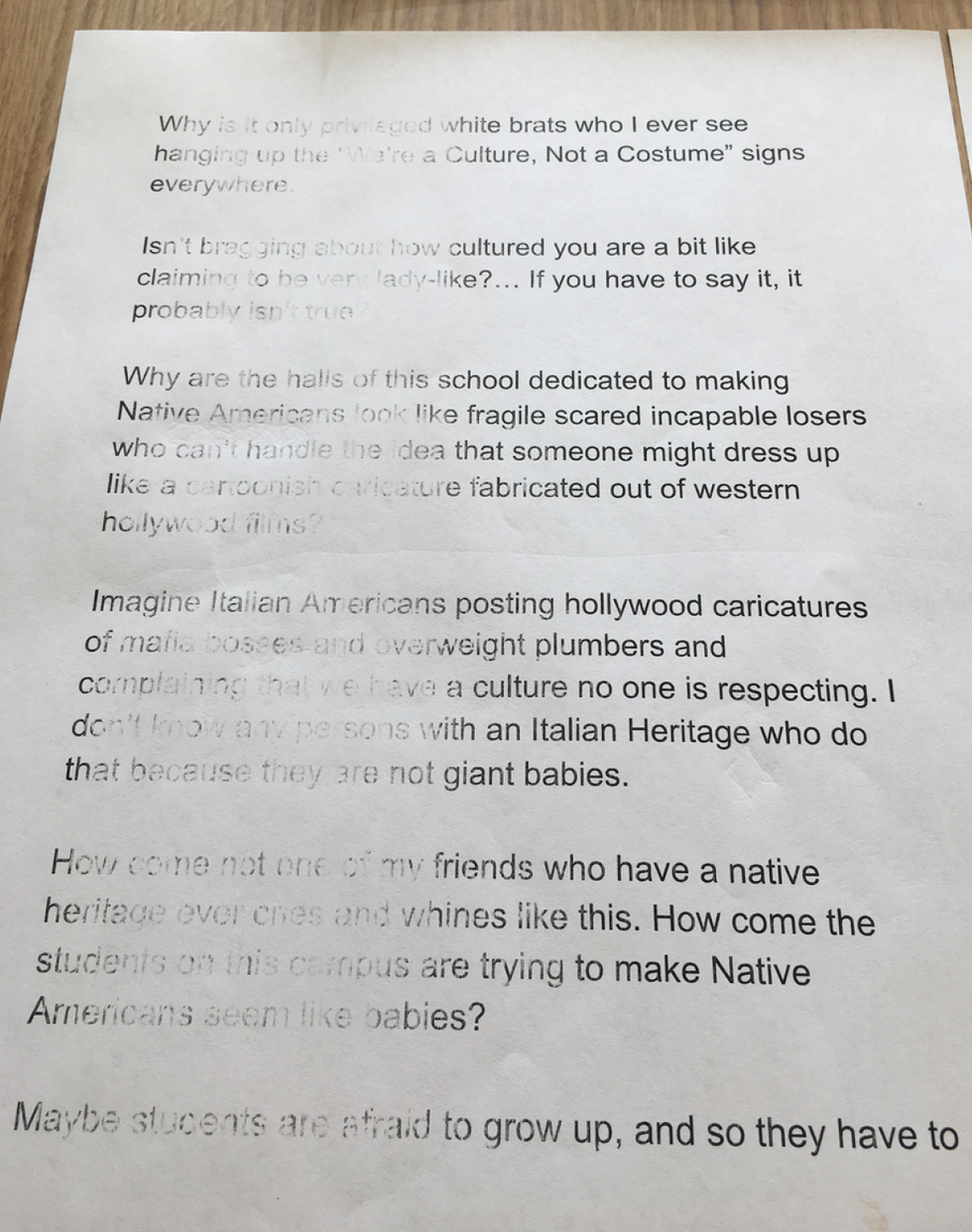 Over the winter I dealt with some guy in a Trump “Make America Great Again” hat holding a sign by the Minerva statue yell racial slurs at me. He’s a character that one. He’s told a friend of mine that Native Americans deserved what happened to them. He even recently wrote a letter addressing our annual “We’re A Culture, Not A Costume” flyer campaign that was asinine and left it in the Commuter Lounge on campus.