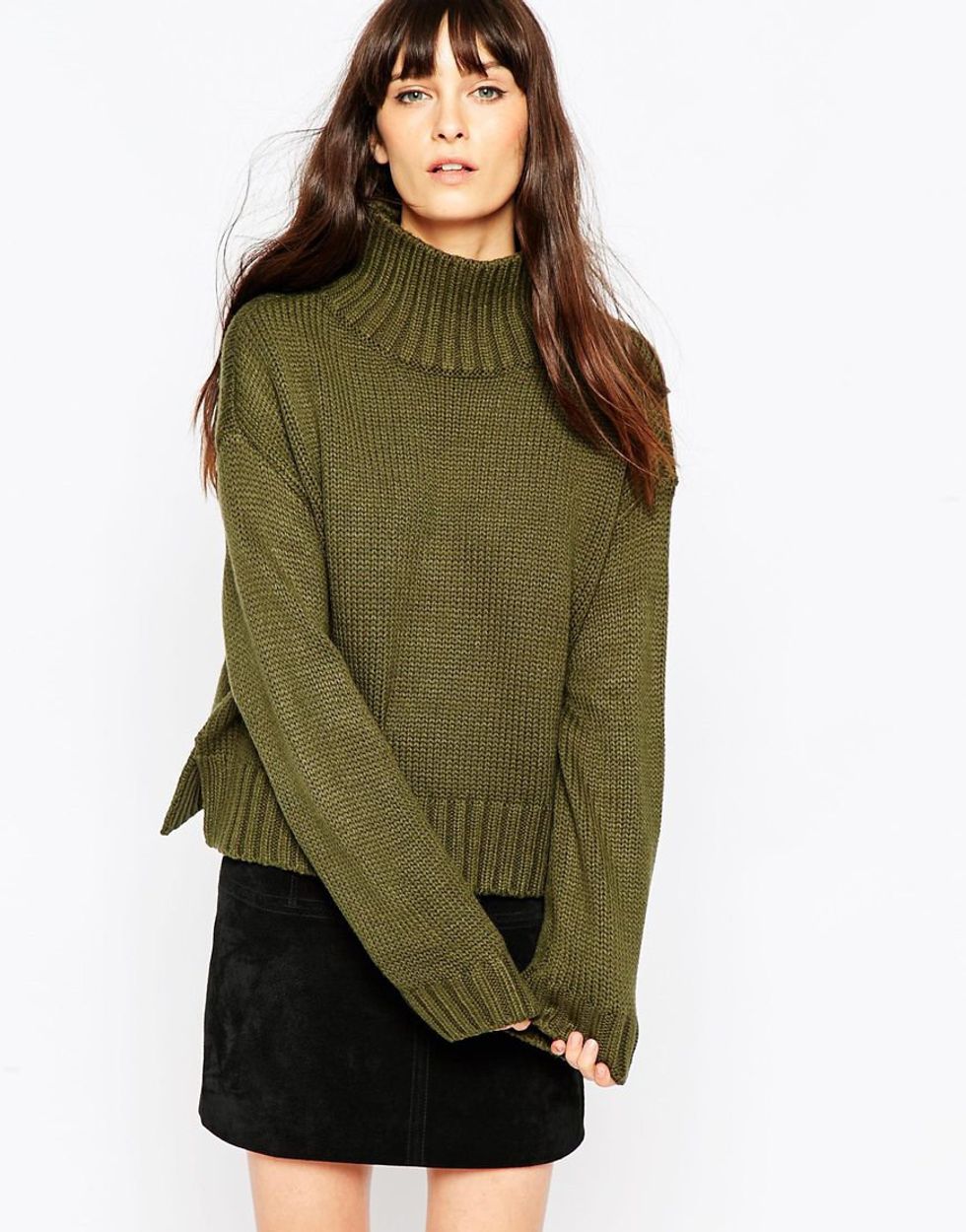 Alternatively, I could take inspiration from the ugly holiday sweater and wear something cozy and seasonal. This chunky sweater tones down the traditional bright green associated with Christmas and combines comfort with style. It can easily be paired with other neutrals, a skirt (as pictured), or a casual pair of skinny jeans.