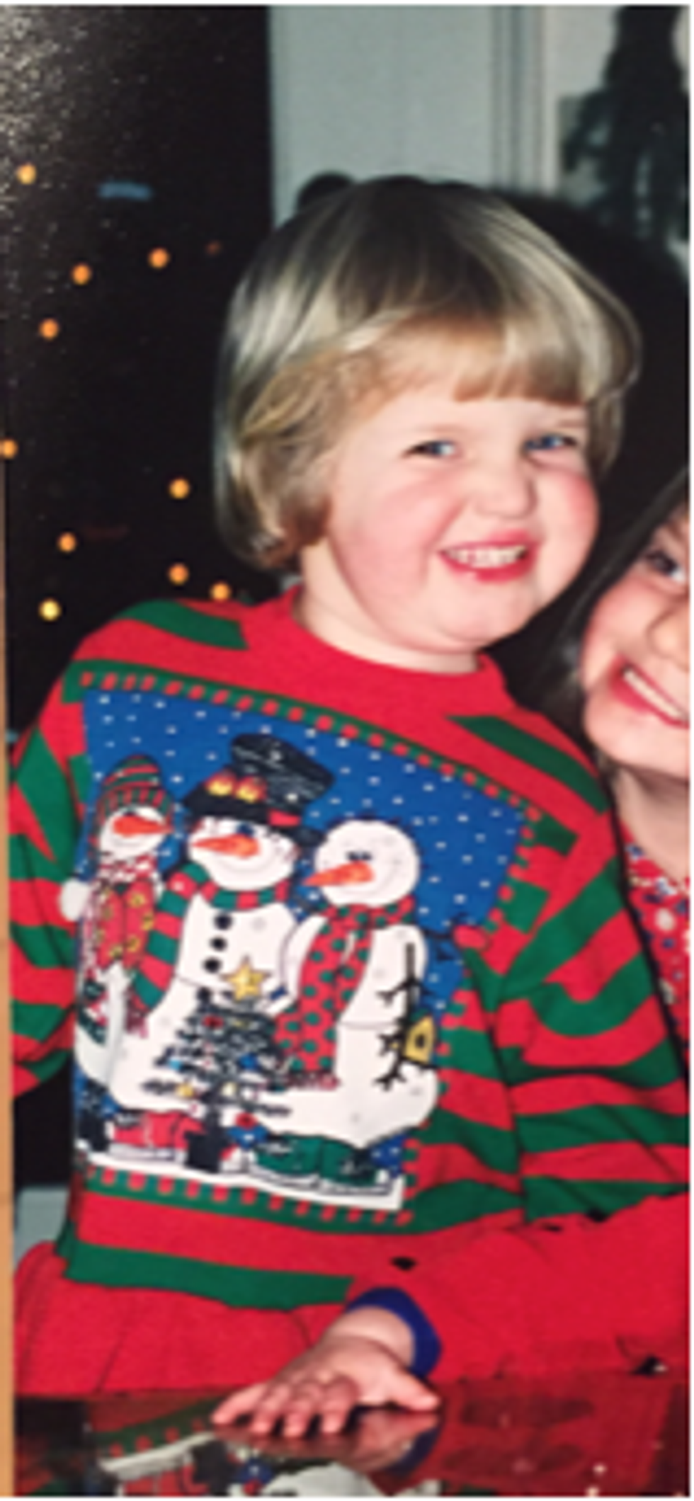 Even though I was so young, I remember loving this sweater. I mean, who wouldn't? It had all the colors of the season, a festive family of snow-people, and a tutu frill attached to the bottom. It was a classic "ugly Christmas sweater." Now sported by college students across the nation for themed parties, the ugly holiday sweater's whimsical legacy lives on.