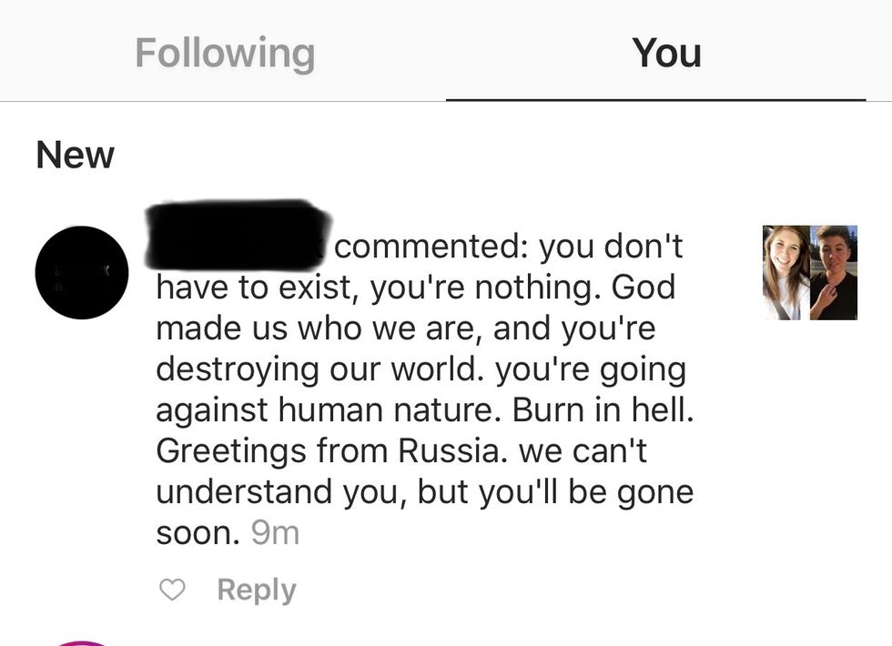 While the data indicates anti-transgender violence, the data does not accurately represent the suicides within the Transgender community. One of the worst thoughts an individual may face is the darkness inside their head that is telling them they are no one. While there are resources on social media for individuals, social media has made violence more apparent with verbal assaults, abusive comments, and hate speech. For I have found myself spamming multiple comments on my profile such as the one below.