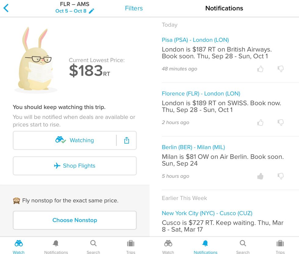 Since flights can often be the most expensive part of a trip, you want to save as much cash as possible by booking at the perfect time. Hopper analyzes flight data and gives you a snapshot of fares and ideal travel dates, letting you know if now is a good time to buy or whether you should keep waiting for prices to drop. You can set up notifications for the app to alert you when certain routes and dates drop in price or are predicted to increase, enabling you to hop on the best deals.