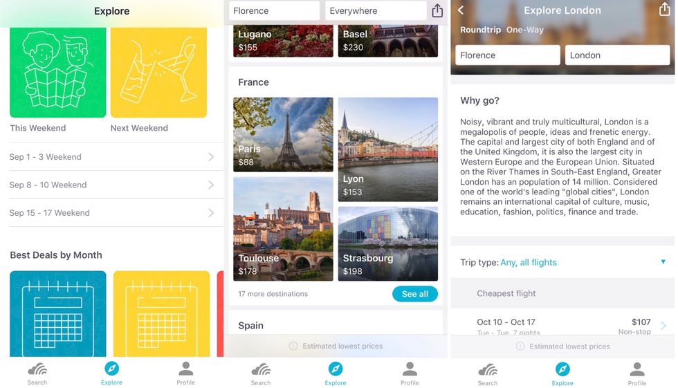 For finding great deals, Skyscanner comes in handy and is great to compare with similar search engines like Google Flights and Momondo. However, one of the best features of Skyscanner is that you can type in your origin and select "Everywhere" as your destination to browse an array of options along with their price points. The app also offers suggestions for the best deals by month or on specific weekends. Once you've selected a destination, Skyscanner even provides a "Why go?" blurb with city highlights – as if you needed any more convincing to embark on that trip.