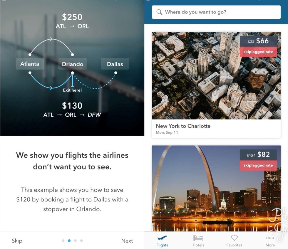 This app is so good at finding airfare deals that United Airlines sued – but Skiplagged won. Using a strategy of finding "hidden-city flights" where you get off at the layover rather than the final destination, Skiplagged is able to save users hundreds of dollars when longer flights are arbitrarily cheaper than shorter flights. For the traveler trying to finesse as much savings as possible, hidden-city flights are a great option to look into.