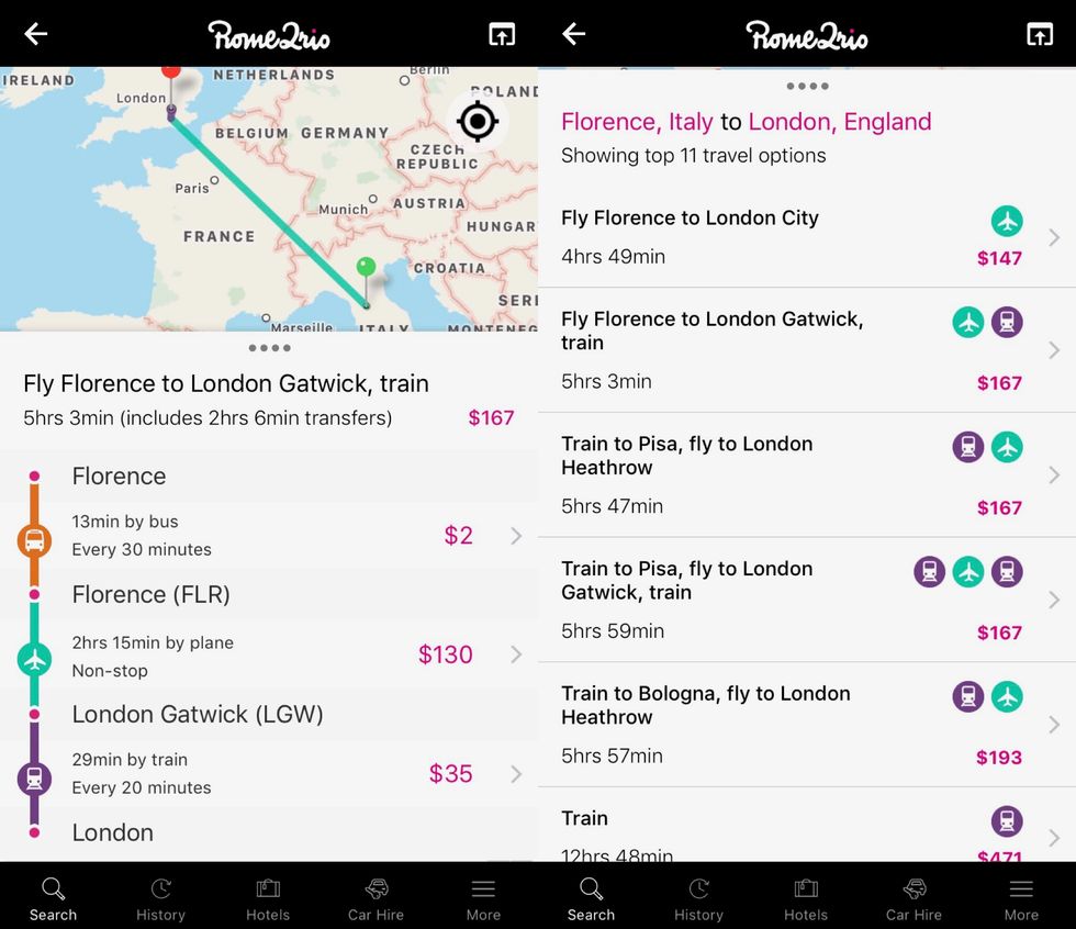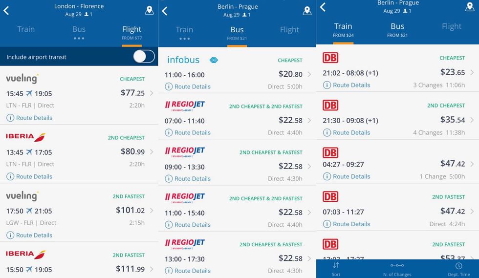 In well-connected places like Europe where you have the ease of choosing between planes, trains, and busses as your mode of transportation, GoEuro provides a succinct snapshot of all your options for getting from one city to another. Compare and sort by price and time so you can find transportation that fits your schedule and budget perfectly.