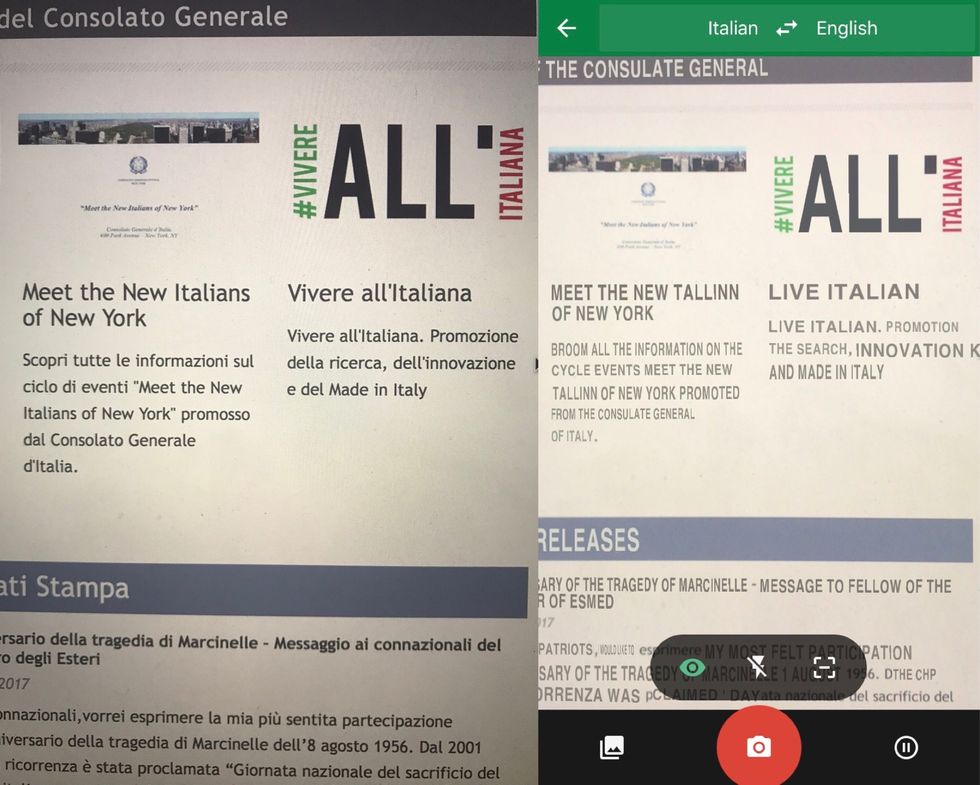 Above: The left side is the Italian Consulate website, almost entirely in Italian, while the right side is my view via the Google Translate app camera, with the text appearing in English.