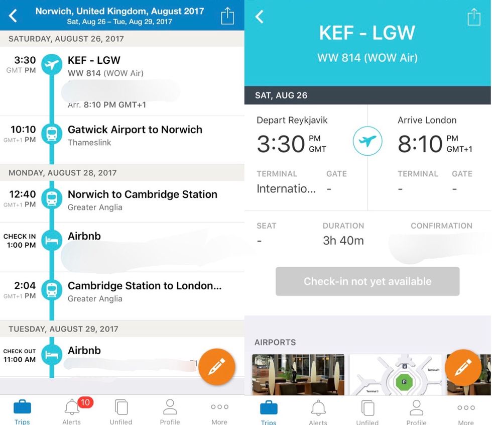 A great alternative to Google Trips is TripIt: if you don't want an app to scan through your Gmail, you can simply forward your travel confirmations to plans@tripit.com and TripIt will automatically create an itinerary to organize your plans in the app. The interface on TripIt includes more detailed time and confirmation number information than Google Trips, but lacks the recommendations search engine for things to do and see.