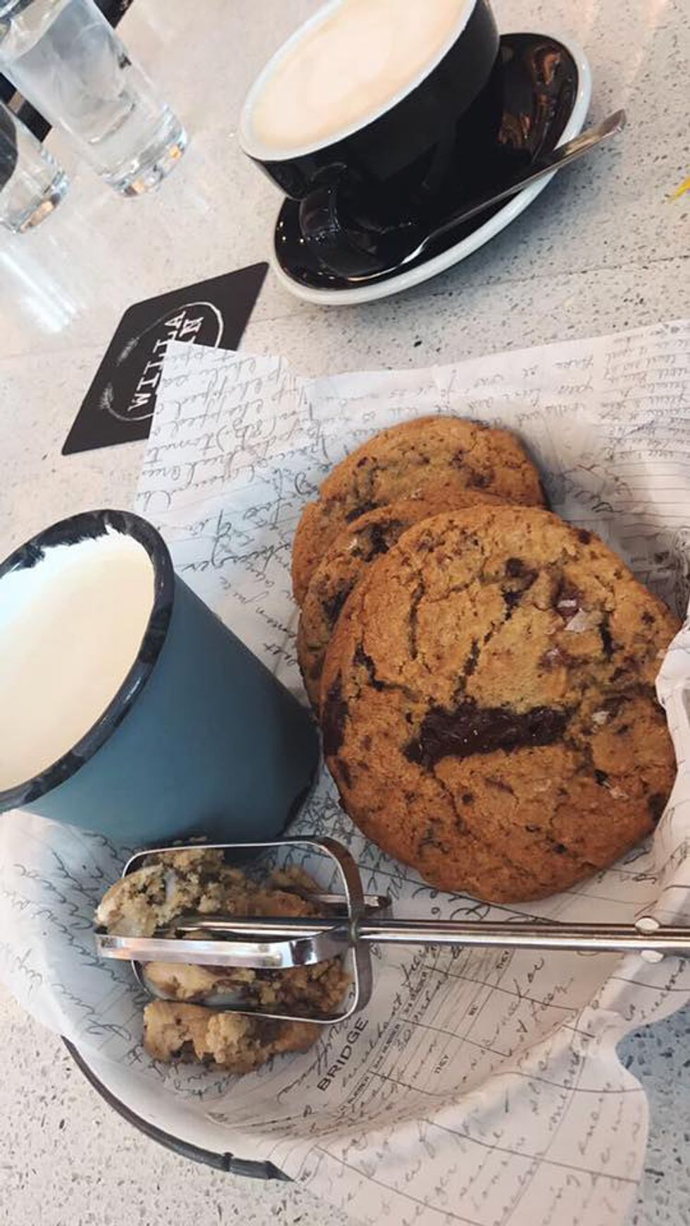 Milk and Cookies dessert from Willa Jean: 3 salted chocolate chip cookies, cookie dough, and a cup of cold, vanilla milk